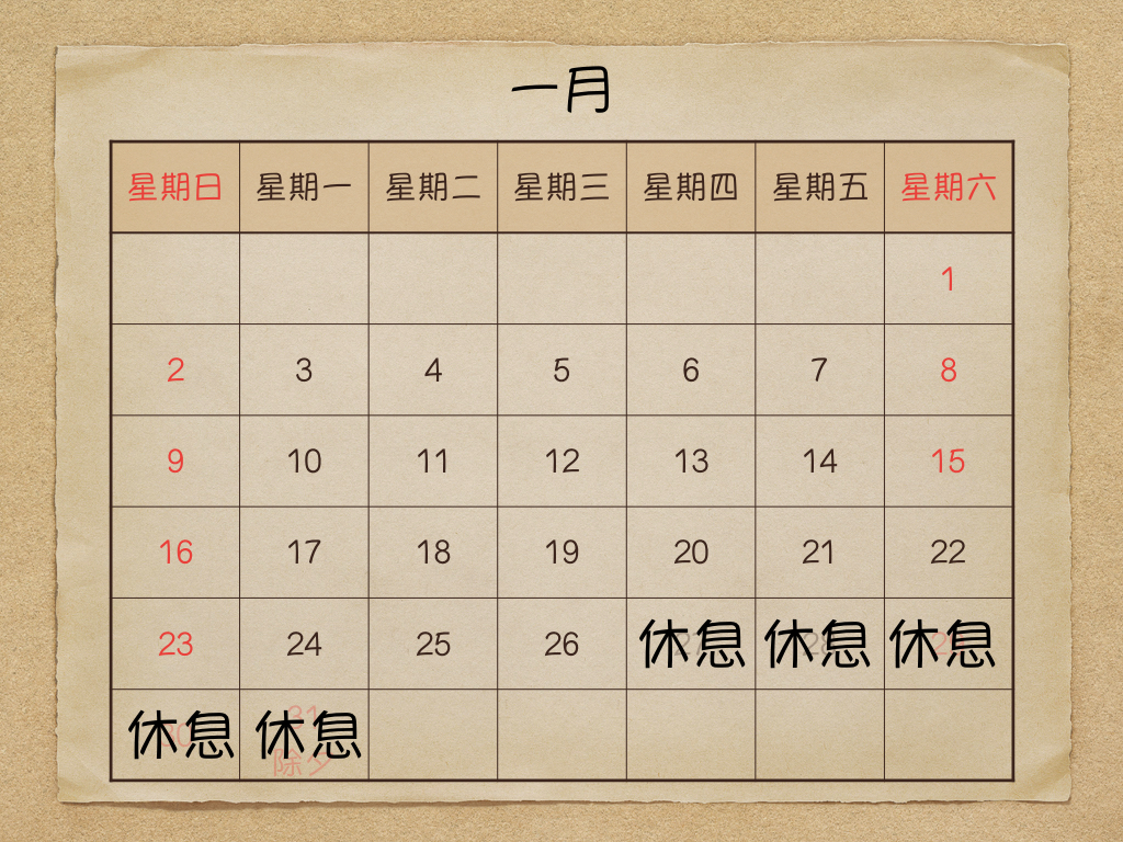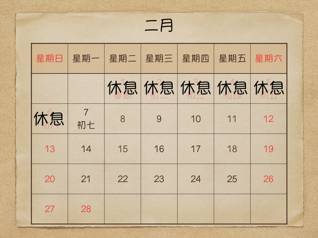農曆年假時間調整 分類:憨吉工作室2022-01-182022-01-18發表於過去的所有公告 2022年的農曆年假時間調整如下圖 1月26號全日可預約,1月27日開始休息 2月7日準時開工 祝大家身體健康,新年快樂 分享此文: 分享到 Facebook(在新視窗中開啟) Facebook 分享到 X(在新視窗中開啟) X 喜歡 正在載入...